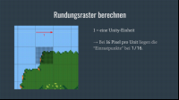 Aufgrund der unbegrenzt fein aufgelösten Berechnung der Bewegungsschritte steht die Dummy-Figur auf beliebigen Pixeln der Bildschirmauflösung. Dieses Video zeigt das Problem und erklärt die mathematischen Hintergründe, die beachtet werden müssen, um das Einrasten in das eigene PixelArt-Raster richtig zu programmieren.