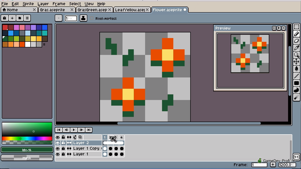 Zur Ausdekoration der Kachel ergänzen wir nun Grashalme, die wir dank Aseprites Frame-Verknüpfung nur einmal für die gesamte Animation zeichnen müssen.