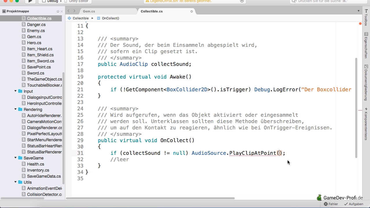 Einsammelbare Objekte verfügen über drei Besonderheiten, die bei der Vertonung zu berücksichtigen sind. Eine davon ist, dass das Objekt bei Berührung zerstört wird, so dass auch der Audioplayer verloren ginge. Den Ausweg stellt eine separate, per Script verwaltete AudioQuelle dar.