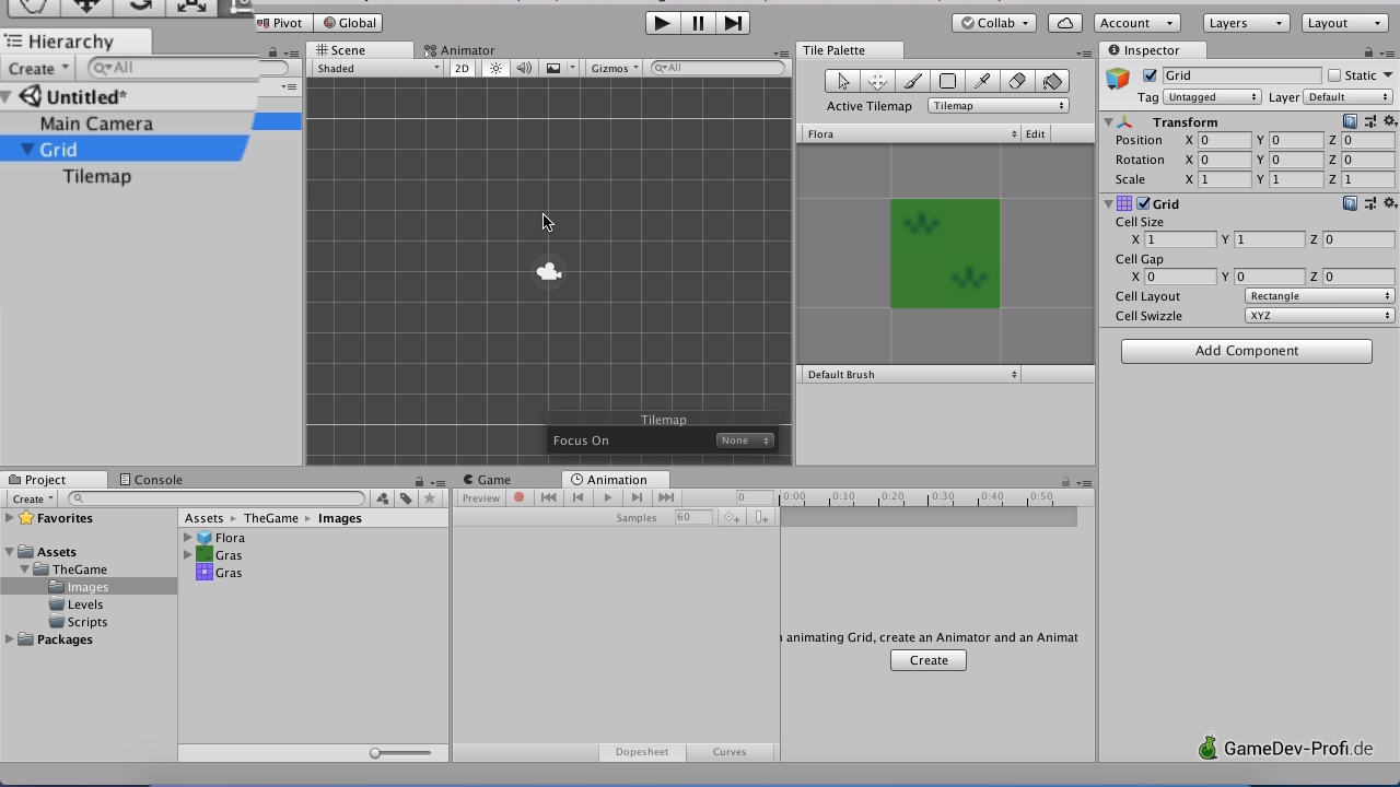 Wir importieren binden unsere Gras-Textur nun in das Tilemap-System ein und erstellen die notwendigen Bestandteile, um die Grasfläche mit grafischen Werkzeugen bearbeiten zu können.
