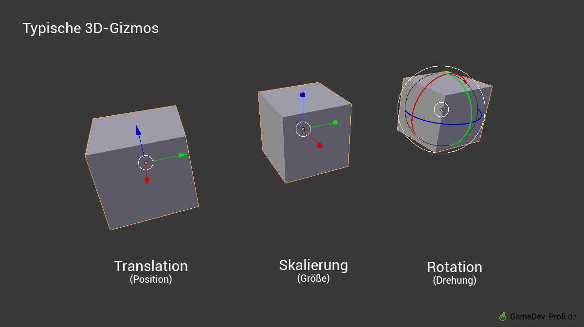 Zwar gibt es Gizmos im Prinzip in fast allen Grafikprogrammen, doch hat sich der Begriff besonders für 3D-Anwendungen gefestigt. Gizmos bestehen oft aus mehreren Bestandteilen, wie zum Beispiel Pfeilen, mit denen sich die Eigenschaften eines Objekts per Mausklick bearbeiten lassen. Dies ist oft intuitiver als die Bearbeitung über das Eingeben von Zahlen und Abmessungen. Typische 3D-Gizmos sind die dreiteiligen Pfeile, Achsen oder Kreise, die das Verändern von Position, Größe und Drehung in den drei Dimensionen x, y und z erlauben.