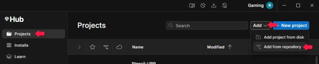 2.1 Wechsle zum Bereich Projekts im Unity Hub.