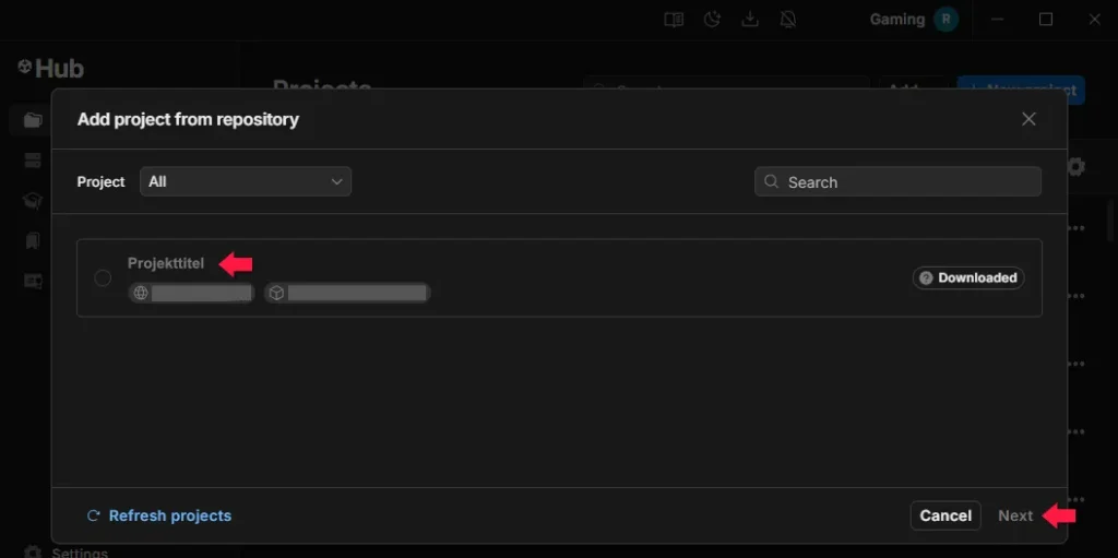 3.1 Im sich öffnenden Fenster sollte das Projekt erscheinen. Wähle es aus und klicke auf Next.