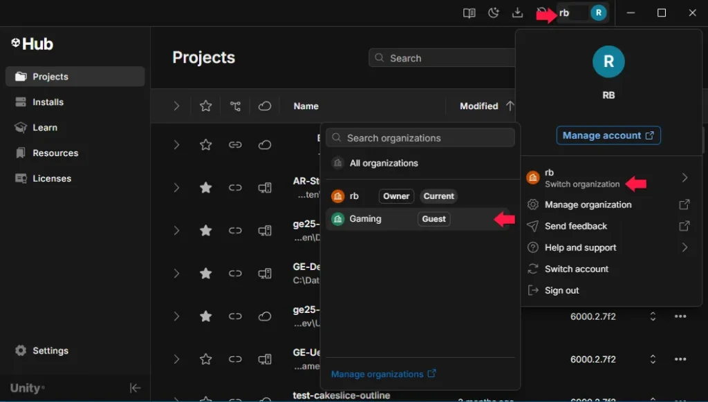 1.1 Gehe in Unity-Hub und klicke oben rechts auf den Benutzernamen.